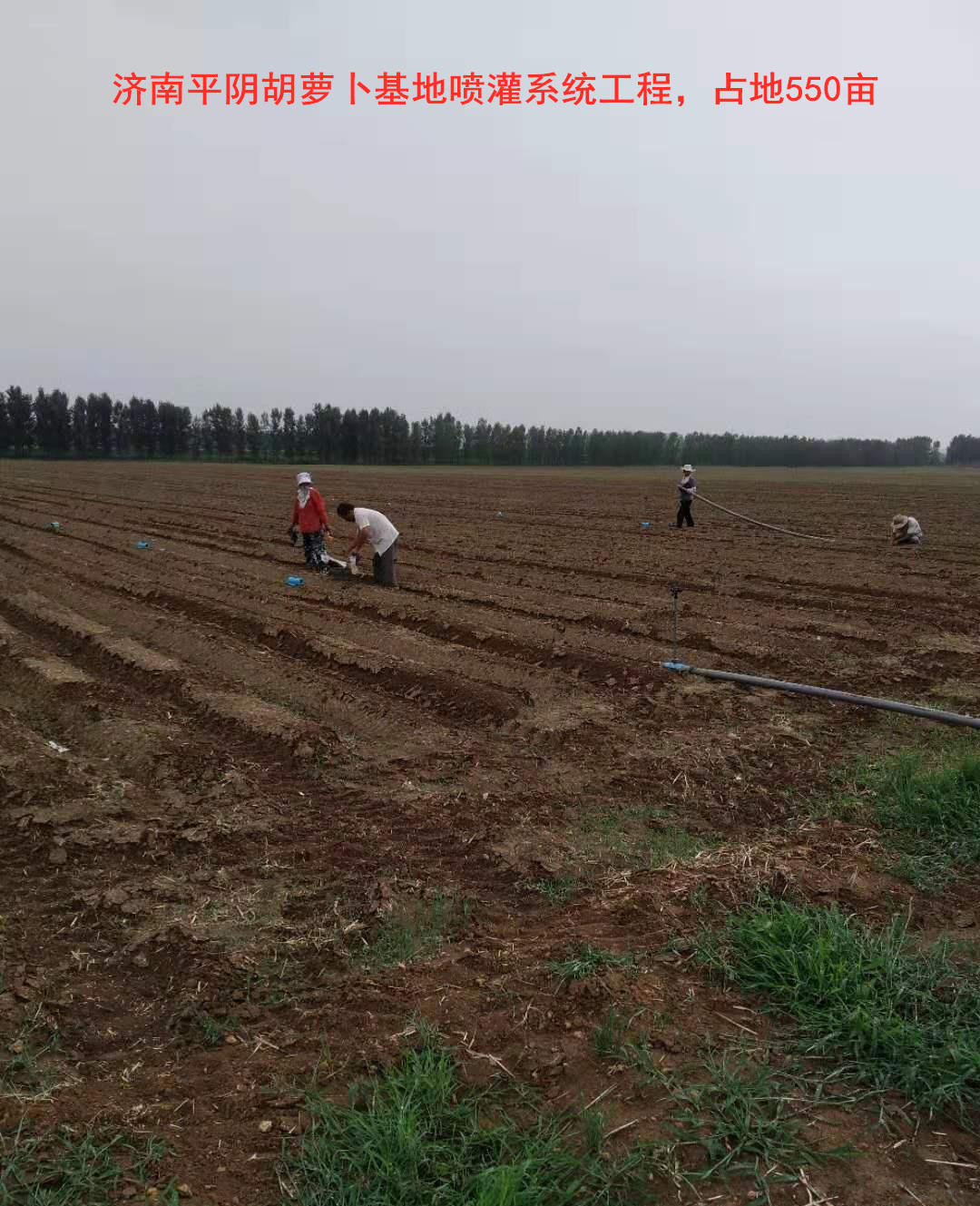 濟南海升水果胡蘿卜基地項目,總麵積為550畝,采用噴灌的灌溉方式,並運用黄瓜AV在线自主研發的可回收噴灌配件,在胡蘿卜收獲季節可以拆卸,方便胡蘿卜的采摘和運輸,需要時經過簡單的組裝又可以實現噴灌功能,得到了用戶的認可和好評!