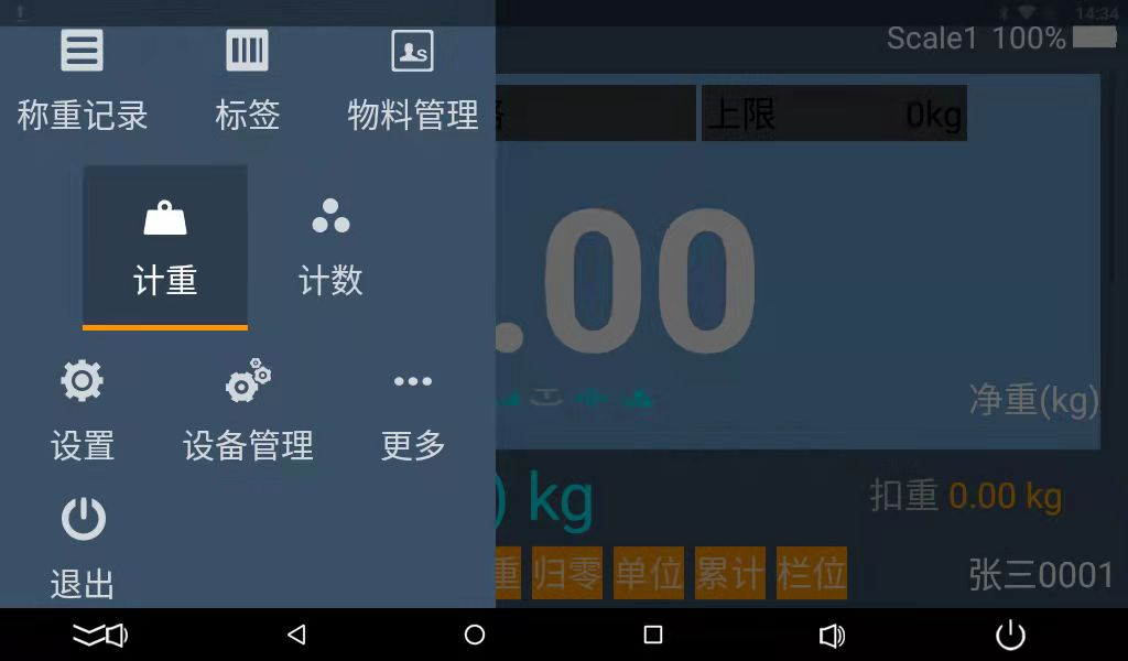 設備開機後,默認為計重功能開啟,左側劃出主菜單欄,包含模塊分別為稱重記錄,標簽,物料管理,計重,計數,設置,設備管理,更多跟退出。