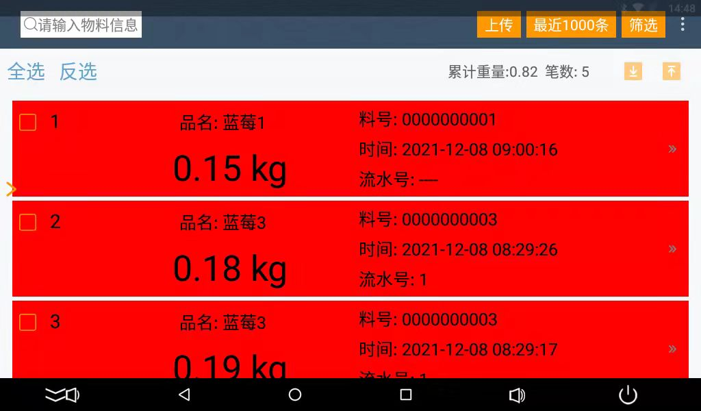 稱重記錄模塊可查詢所有稱重信息記錄,包含重量,品名,料號,時間,用戶名等信息,自動生成稱重信息報表,可按不同篩選條件篩選信息,可選擇信息進行打印標簽,藍牙導出,優盤導出等操作,導出信息為以導出時間為名稱的電子表格,導出後可直接對電子表格進行統計編輯。