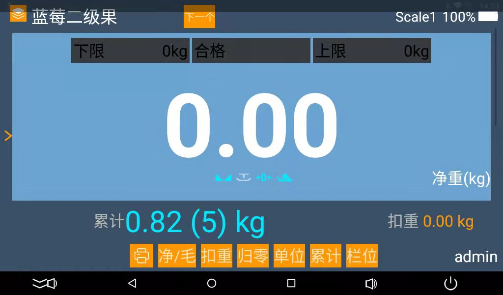 計重頁麵顯示當前稱重信息,左上角可選擇物料種類,也可點擊下一個切換到下一物料,右下角顯示當前登錄用戶名,默認管理者賬號為admin,當前頁麵下刷卡可直接登錄新用戶。