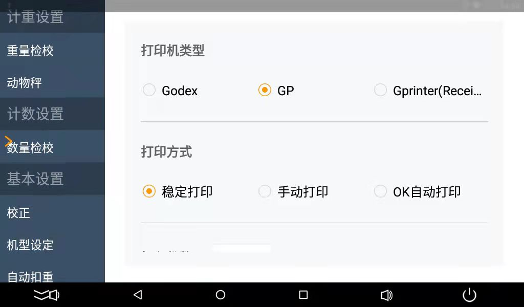 設置頁麵可上下滑動,設置設備的各種參數,打印設置裏可設置打印機類型及打印方式以及稱重信息的PC輸出方式。
