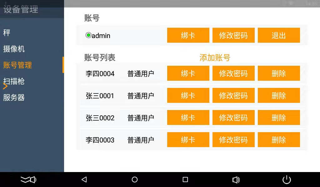設備管理頁麵包含各硬件信息及賬號信息,係統默認admin管理賬號,擁有全部權限,登陸後可添加賬號,添加的賬號分為普通用戶跟監督者賬號,普通賬號隻擁有部分權限,可登陸可稱重,但無權更改設置,監督者賬號跟管理者權限相同,添加的賬號需要設定密碼,便於密碼登陸,點擊綁卡後可設置卡號,之後便可刷卡登陸。